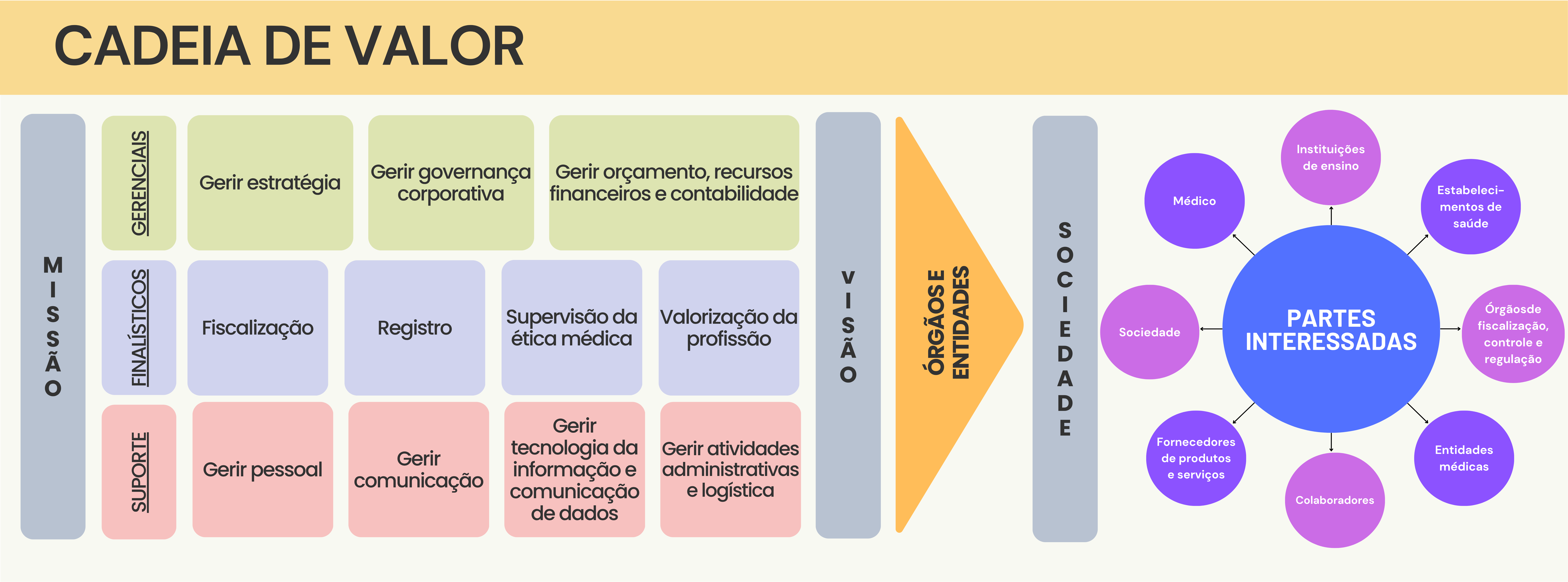 a) finalísticos: são as atividades essenciais para cumprir a missão institucional do Conselho, gerando entregas diretas às partes interessadas. Refletem as competências legais da instituição (fiscalização, registro, supervisão da ética médica e valorização da profissão);